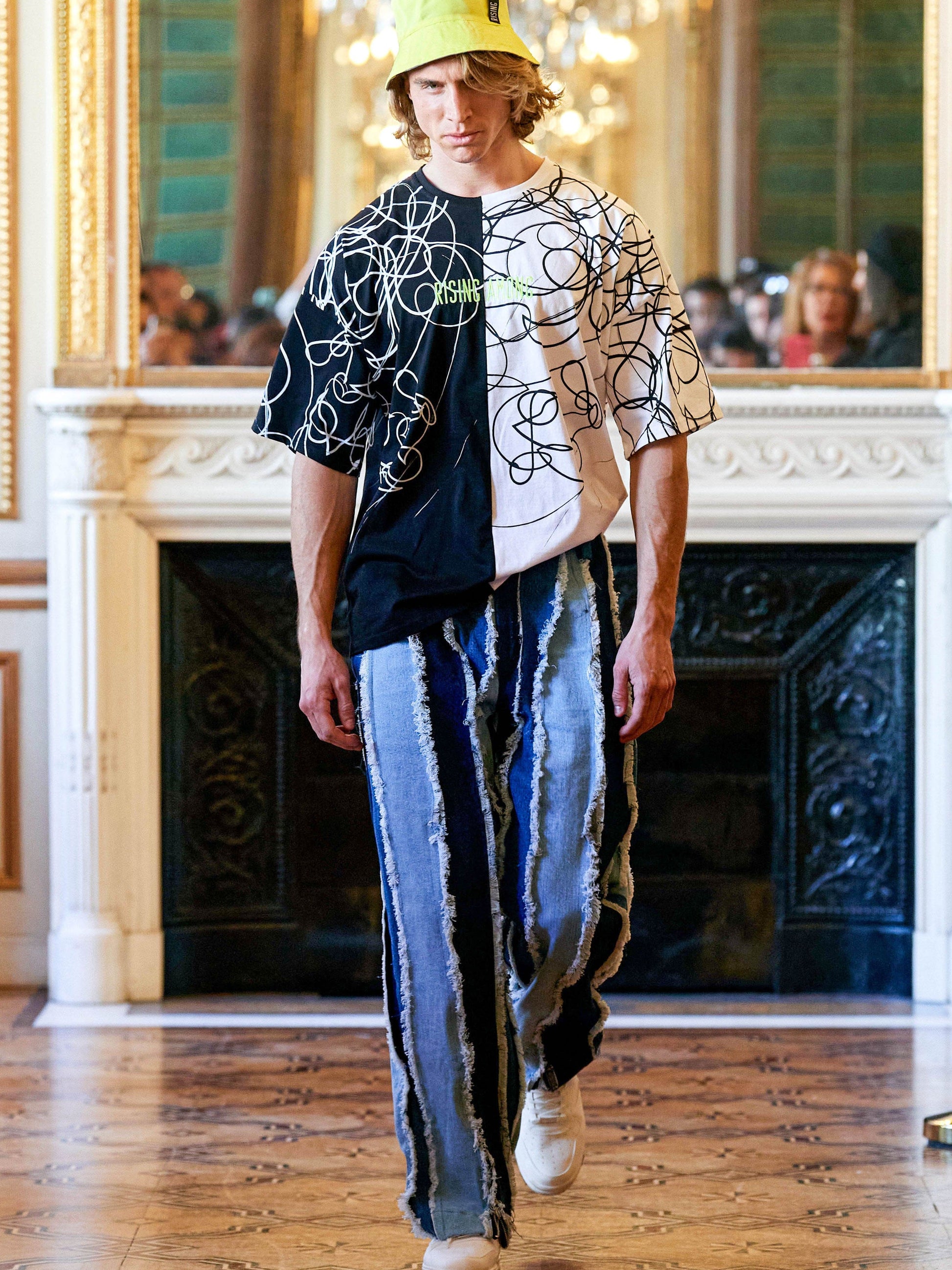 Trust us, you’ve never seen a Denim like this one before! Hand-cut, hand frayed panels of true shades of denim are hand-stitched together to form these unisex relaxed fit pants. They feature fly front, belt loops, side pockets and back pockets and zipper opening from the bottom front.