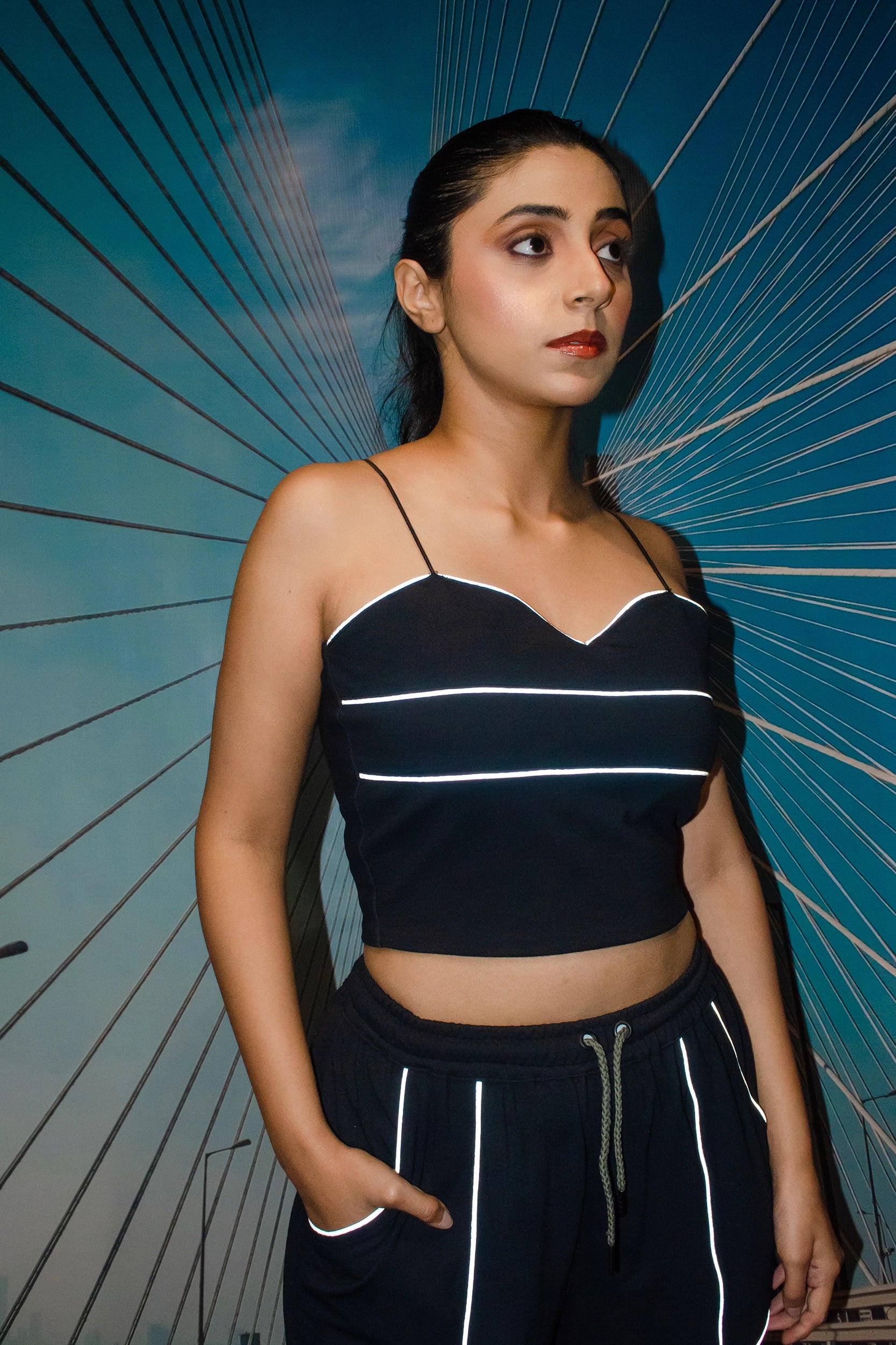 A rave party without this co-ord set is incomplete. Featuring the reflective strap crop top & jogger pants, it's a perfect balance of statement, eye catching energy and comfort. Made in super soft Cotton PQ blend with accents of reflective piping which glows with flash.